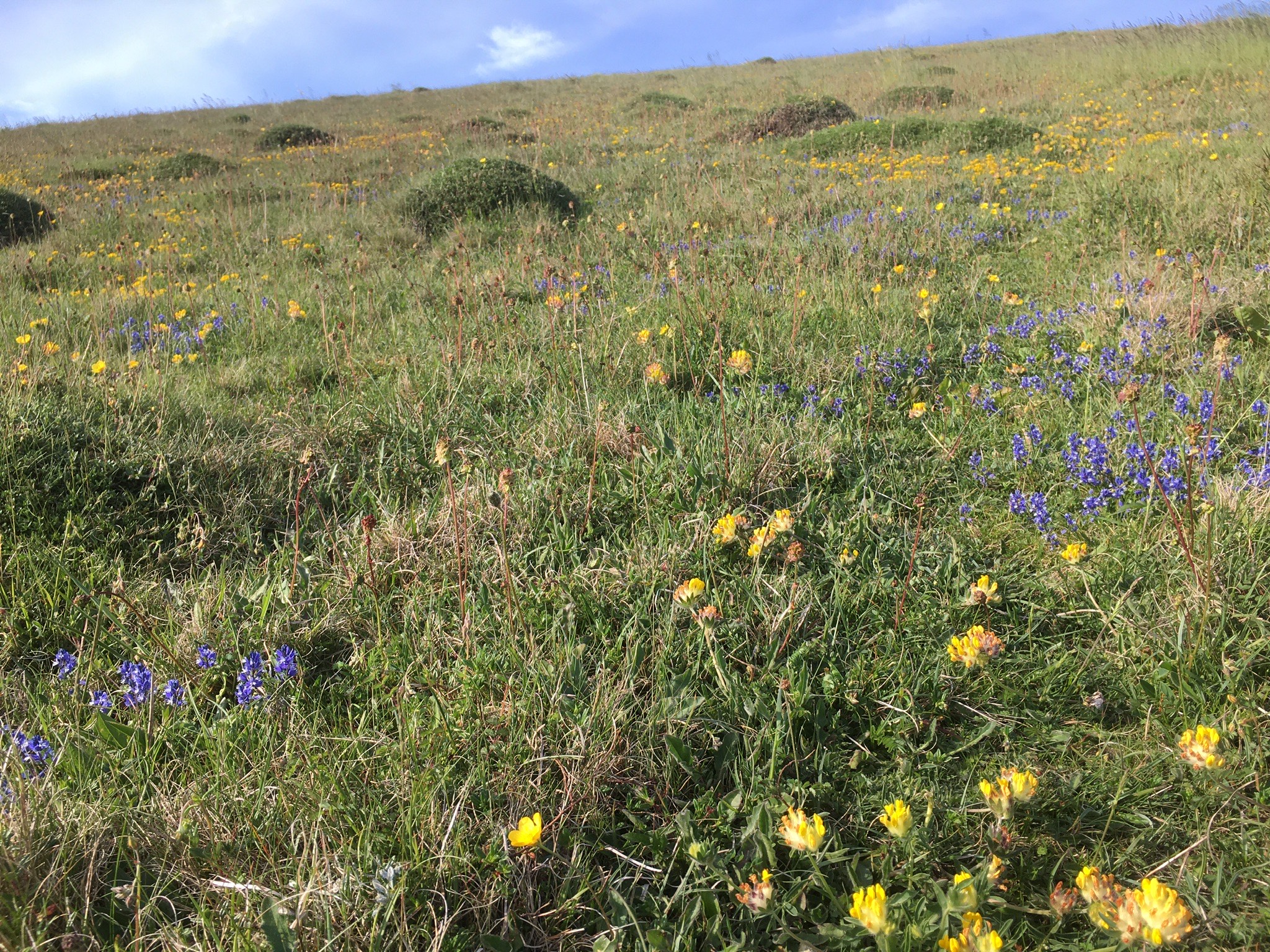 The climb didn’t matter much, as I couldn’t take my eyes off the close-embroidered, mat-forming, tump-hugging glory of the early summer wildflowers: cottony kidney vetch, sky-blue chalk milkwort, yellow rock rose, salad burnet and sainfoin – all attended by so many glittering winged insects, including dozens of iridescent verdigris-green ‘scarce forester’ moths & a similar number of tiny, fast-tumbling Duke of Burgundy butterflies, in their chocolate-orange chequerboard finery.